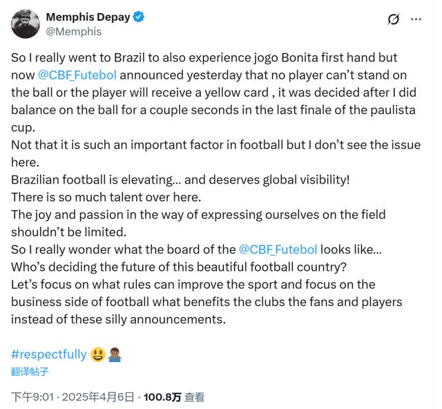 德佩还写道:“我来巴西首先也是为了体验‘Joga bonito’(踢出美丽足球),可现在巴西足协却在昨天宣布任何球员都不得站在足球上,否则的话这位球员就会吃到黄牌。这是在我于圣保罗州联赛决赛中在足球上站了几秒钟之后做出的决定。